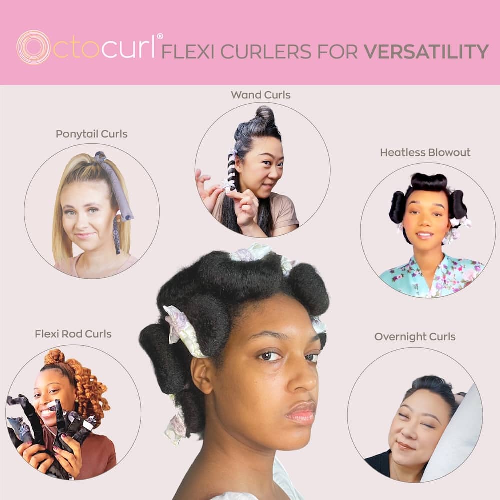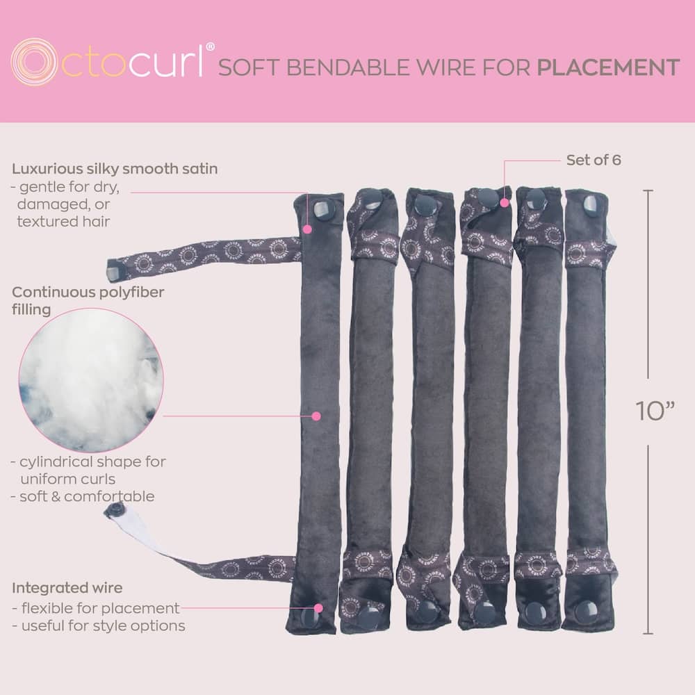 2) FLEXI ROD CURLS - Perform like flexi rods, but softer and more comfortable. Style curls all the way to the root positioned exactly where you want them. Add volume in the crown area by rolling the curlers at the root for a Heatless Blowout.  Fold the ends of the flexible curlers to secure.