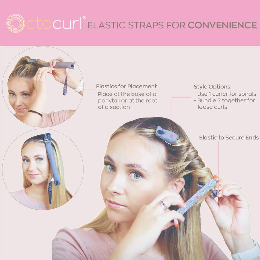 HEATLESS BLOWOUT: Strap 2 (or more) together using the elastic straps and roll along the crown area for a Heatless Blowout. This method produces a lot of volume and soft loose curls. See video tutorial for step by step.